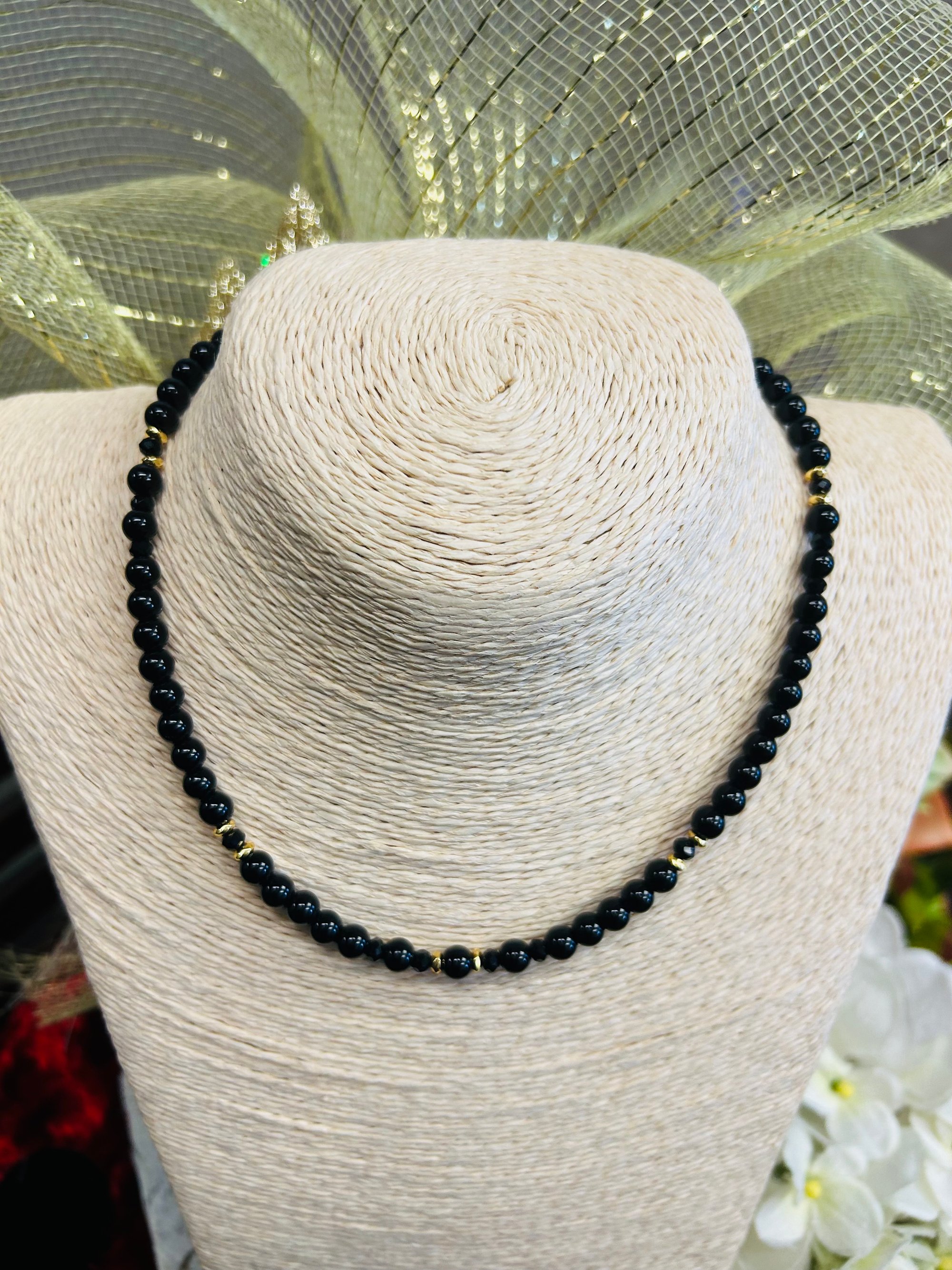 Black Beaded Necklace with Gold Accents