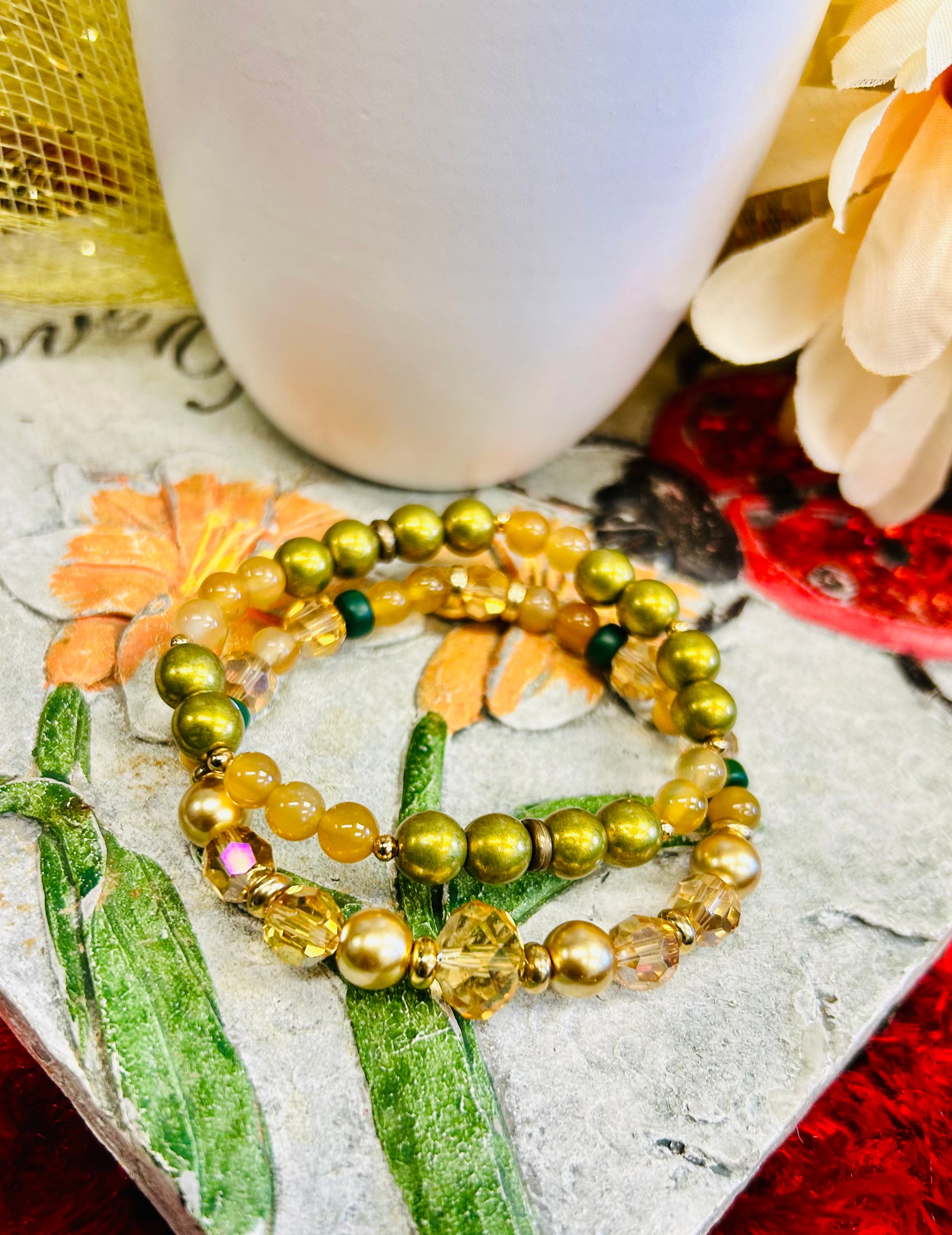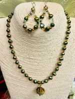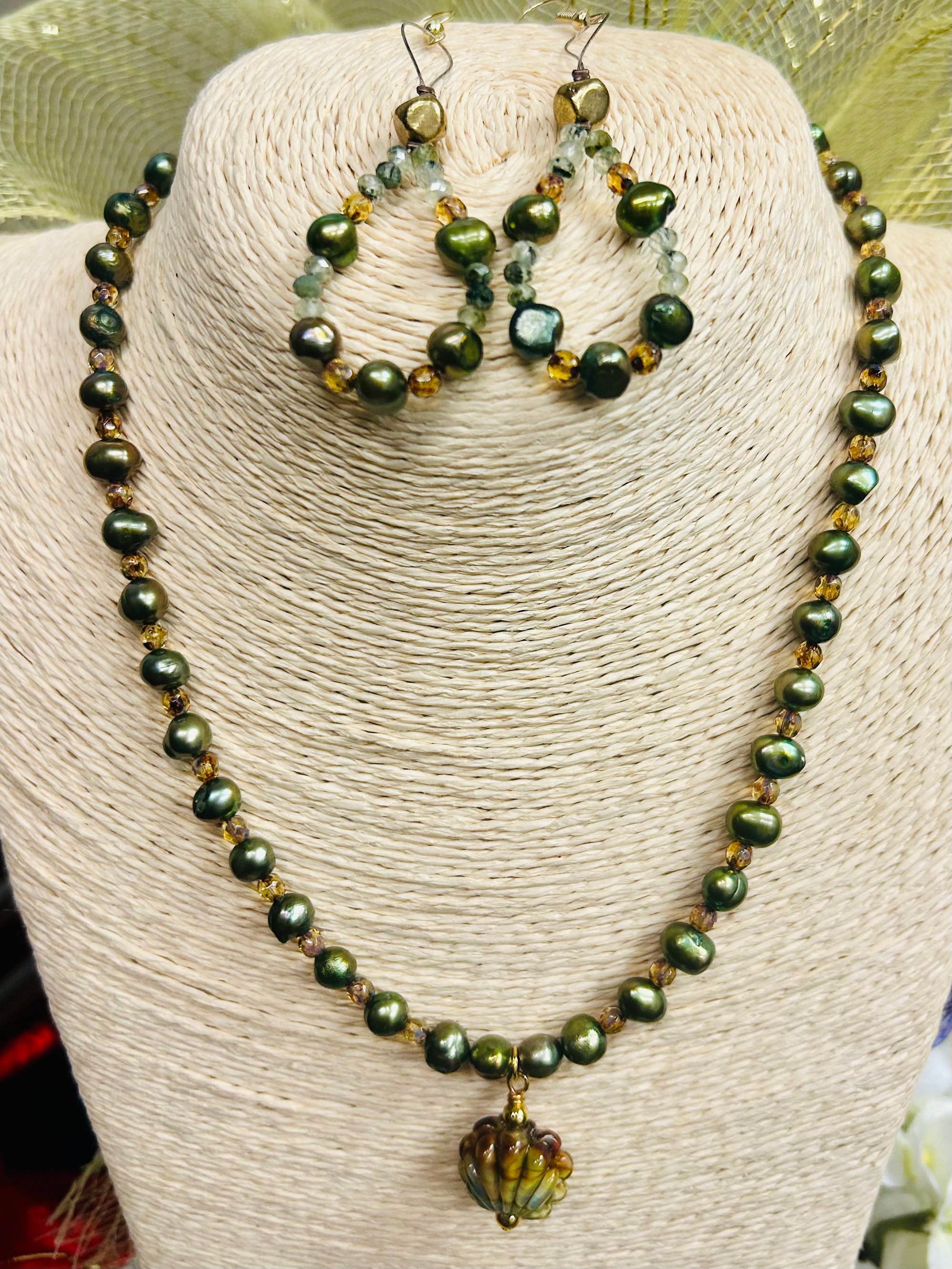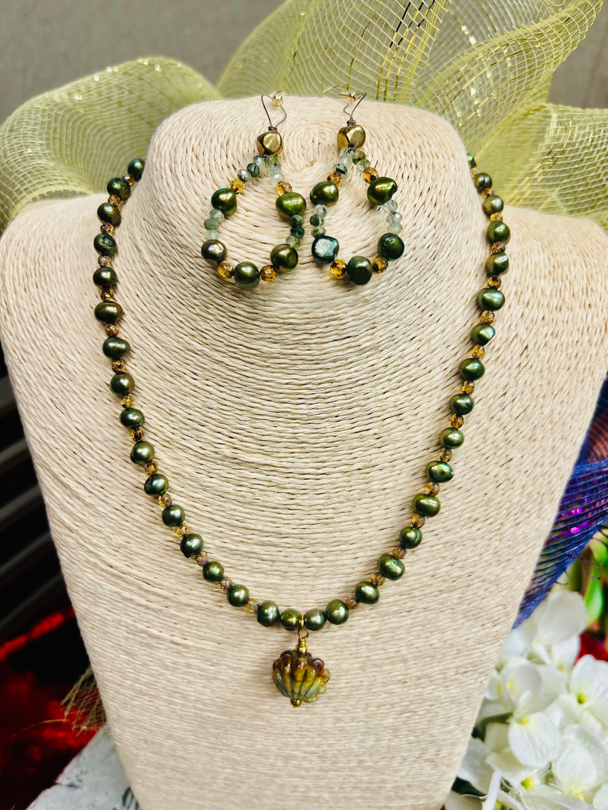 Green freshwater pearls beaded necklace, earrings and bracelet set